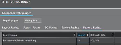 Für den Terminal wird ein spezieller Benutzer angelegt, mit welchem auf SIHOT zugegriffen wird. Dieses Benutzerkonto gehört einer Benutzergruppe an, der ausschließlich das Kiosk-Inventory (inventory_gubse60) angezeigt wird. Dieses Inventory enthält genau den hierfür vorgesehenen Funktionsumfang, d.h. es ist ausgeschlossen, dass Gäste über den Kiosk Zutritt zu SIHOT.PMS erlangen. Der Benutzergruppe wird außerdem in der Rechteverwaltung das Feature-Recht Buchen ohne Schichtanmeldung erteilt, so dass Zahlungen am Terminal vorgenommen werden können.