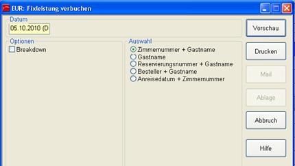 Bitte prüfen Sie in diesem Zusammenhang, dass die Rechnungsmodalitäten für den Standardfall im Hotelstamm korrekt festgelegt wurden, um korrektes Verbuchen der Fixleistungen zu gewährleisten.