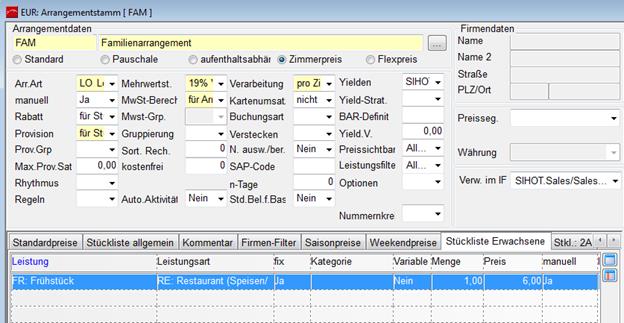 Bei Zimmerpreis-Arrangements kann die Stückliste auch bezogen auf Personentypen eingegeben werden, d.h. die Eingabe der Stückliste kann für Erwachsene und für die einzelnen Kinderkategorien verschieden eingegeben werden. Z.B. Sie können Erwachsenen einen Frühstückspreis von € 6,00 und Kindern einen Preis von € 4,00 für das Frühstück berechnen.