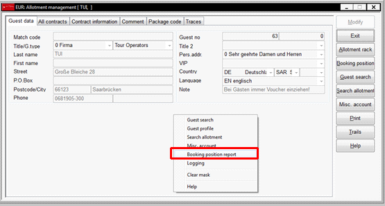 Alternatively, open the respective guest profile, call up the context menu and select booking position report.